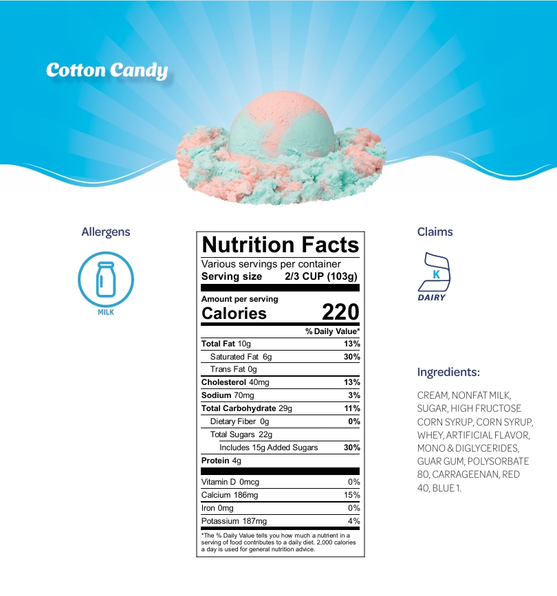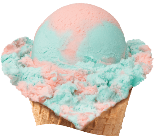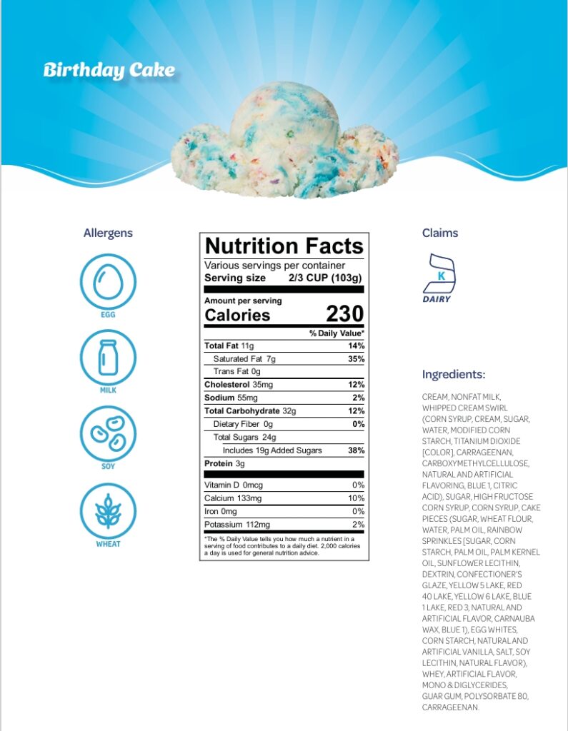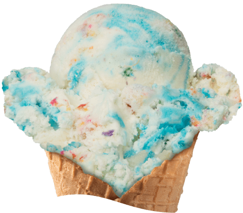 Cake flavored ice cream with a bright blue frosting swirl and confetti colored cake pieces.