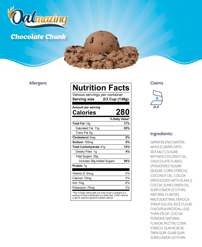 Real chocolate chunks in a chocolate, small-batch, Oatmilk based, non-dairy frozen dessert.