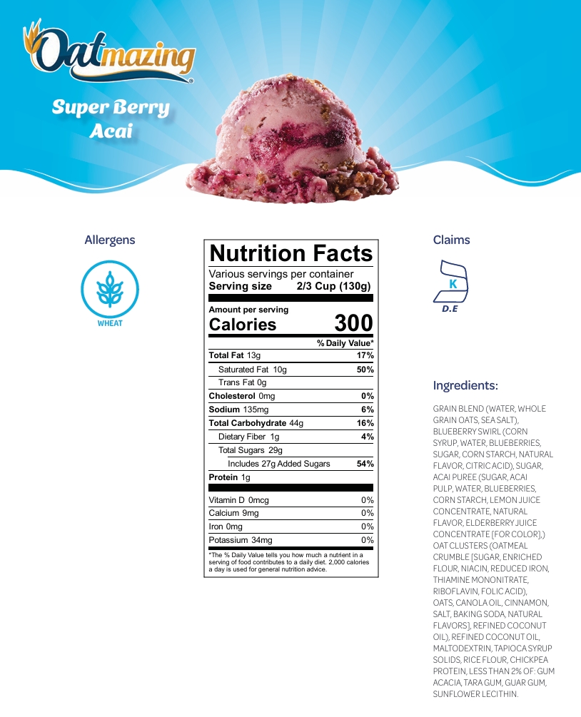 A sweet and tart oat based non-dairy dessert with a blueberry swirl and cinnamon oatmeal clusters.