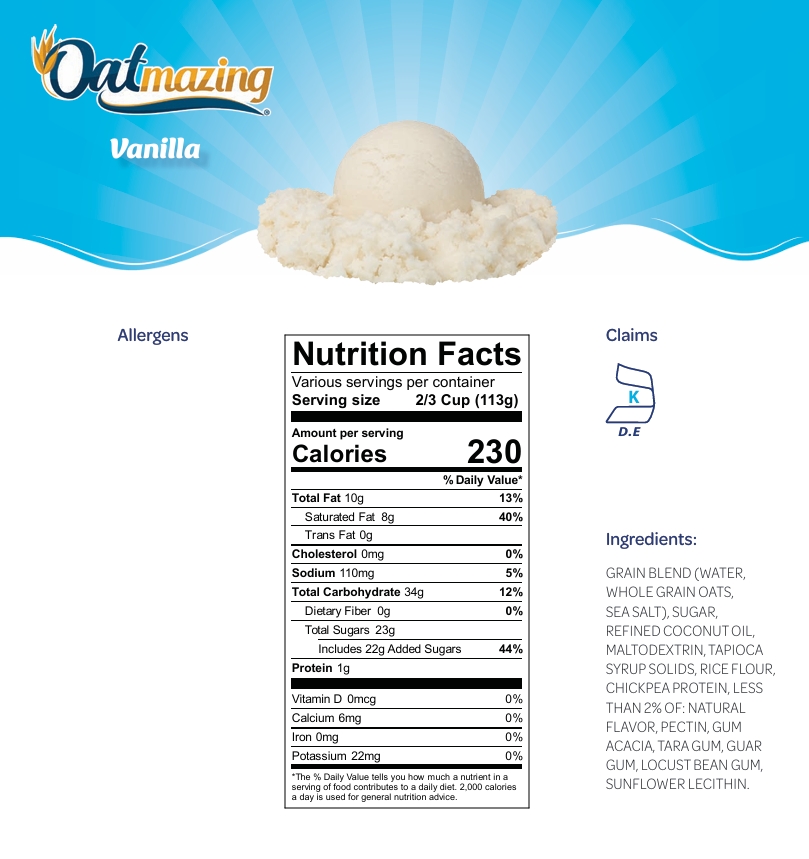 Classic vanilla flavor in a small-batch, Oatmilk based, non-dairy frozen dessert.