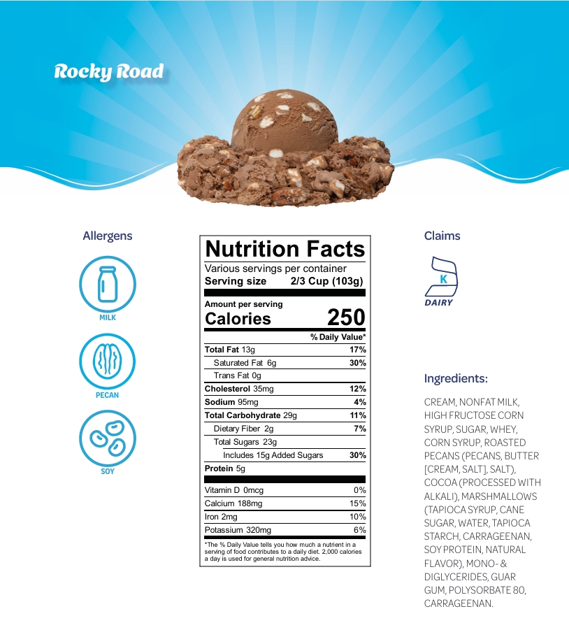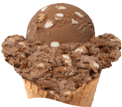 Loads of fresh roasted pecans and mini marshmallows blended with a rich premium chocolate ice cream.