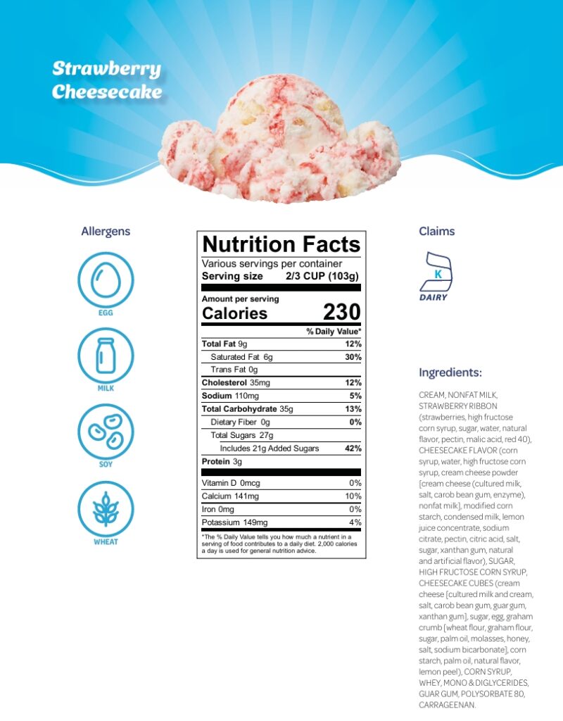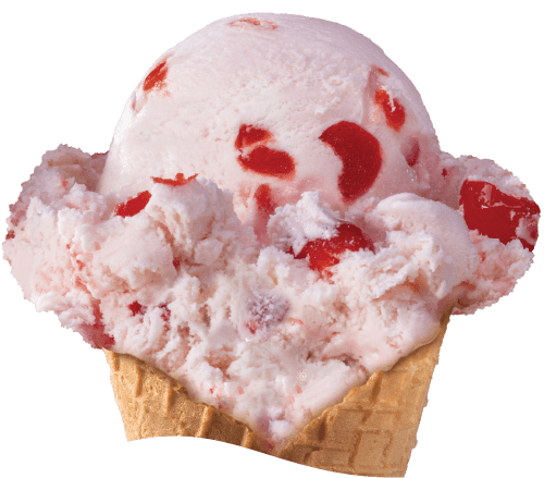 Cheesecake ice cream swirled with strawberry sauce and cheesecake pieces.